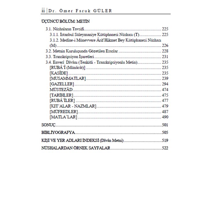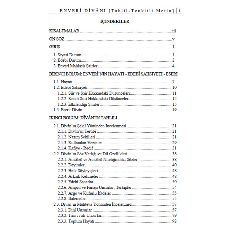 “Enverî Dîvânı [Tenkitli Metin-Tahlîl]” başlıklı doktora tezinden üretilen bu çalışma, giriş ve üç bölümden oluşmaktadır. Giriş bölümünde Dîvân’ın yazıldığı dönem olan XVII. yüzyılın siyasi ve edebî durumu hakkında genel bilgiler verilmiştir. Birinci bölümde, Dîvân metninden yola çıkılarak şairin hayatı, edebî kişiliği ve eseri hakkındaki malumat yer almaktadır. İkinci bölümde, eserin detaylı tahliline yer verilmiştir. Bu kısımda Dîvân’ın biçimsel hususiyetleri ile söz varlığı yanında klasik Türk edebiyatı geleneği içerisindeki yerine, şairin kullandığı unsurlara ve bu unsurların metindeki işlevlerine dikkat çekilmiştir. Çalışmanın üçüncü bölümünde ise Dîvân’ın tenkitli metni bulunmaktadır. Bu bölümde eserin elde bulunan iki nüshası karşılaştırılmış, nüshalar arasındaki farklılıklara dipnotlarda dikkat çekilmiştir.